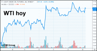WTI máximo intradía de 57,59 dólares, y mínimo intradía de 56,67 dólares.
